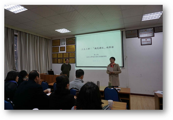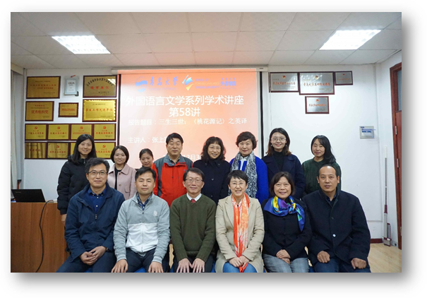 在博文楼312会议室举行“外国语言文学系列学术讲座”第58讲。翻译理论及文化研究著名台湾学者张上冠教授应邀作“三生三世:《桃花源记》之英译”的专题学术讲座。院长卞建华主持讲座,51吃瓜部分老师及研究生参加此次讲座。