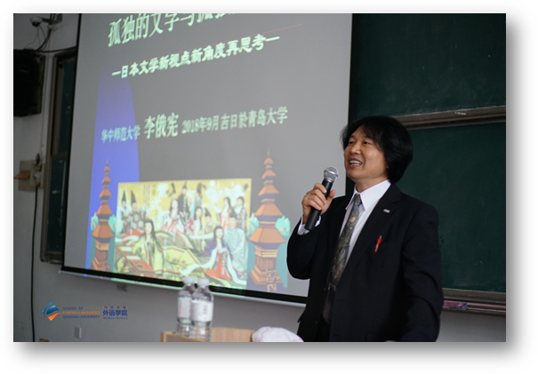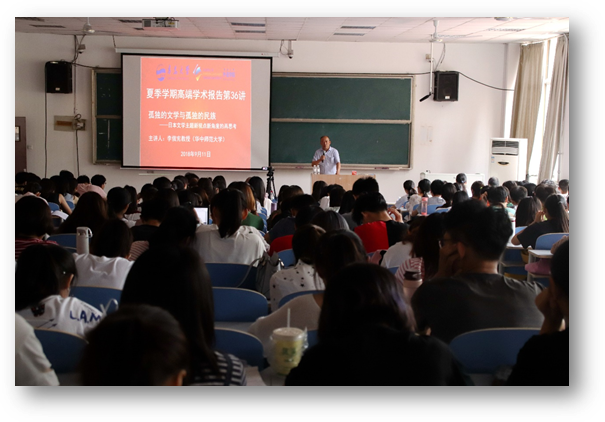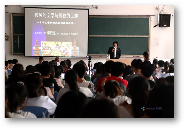 在博远楼101教室举行夏季学期高端学术讲座第36讲。华中师范大学外国语51吃瓜副院长、博士生导师李俄宪教授应邀作“孤独的民族与文学的孤独——日本文学新视点新角度再思考”的高端学术讲座。日语教学系主任杨剑老师主持,外院师生200余人聆听了讲座。